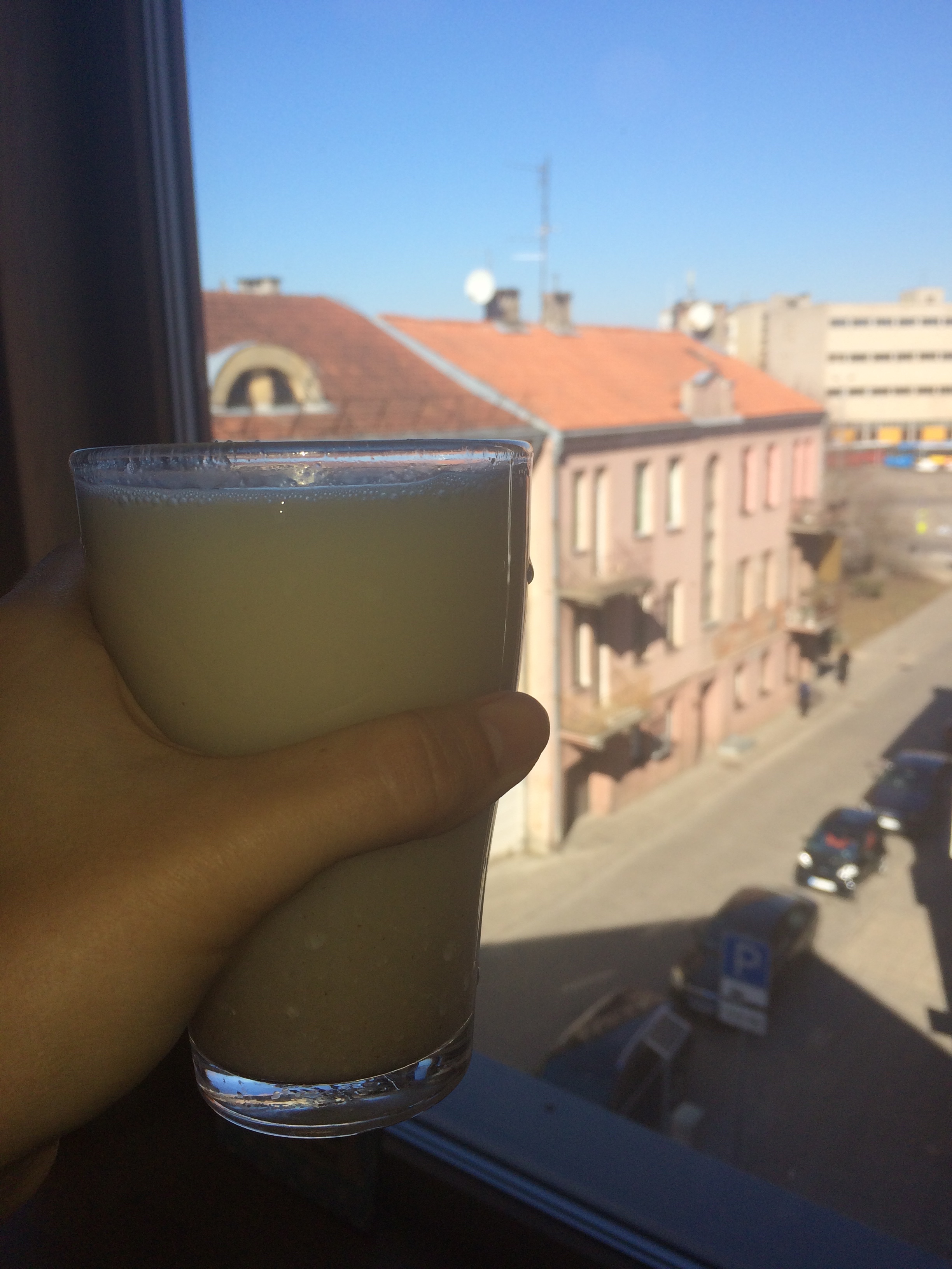 - 4 datules (nei kiek nesaldintas man nelabai patinka. Galima datules keisti klevų, agavų ar kitu sirupu, jo dėti pagal skonį. Bet pabandykit ir nesaldintą, o gal ims ir patiks?)