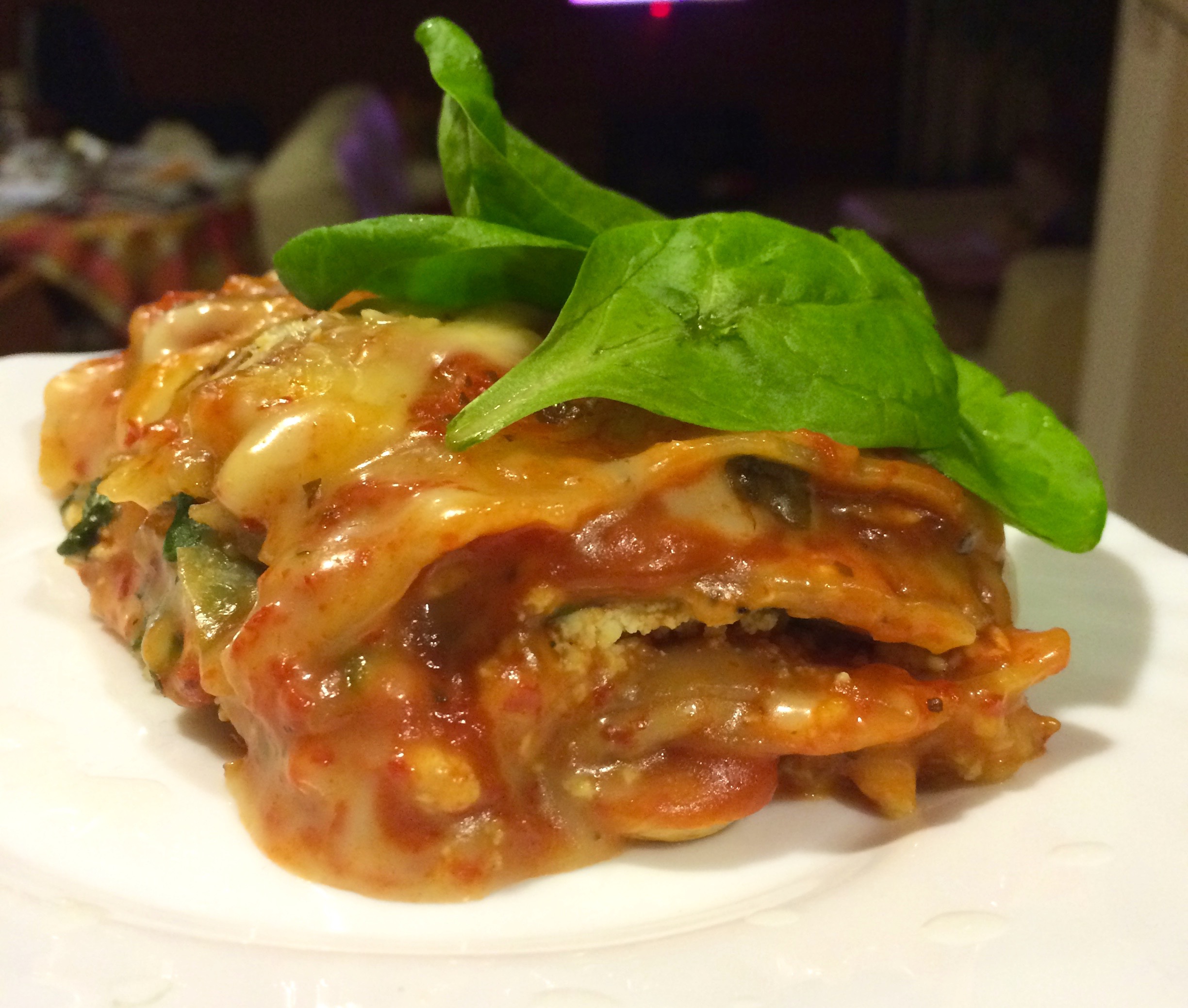 - sluoksniavau taip: PP (trump. pomidorų padažas), lakštai, PP, lakštai, PP, grybai, sūris, PP, lakštai, PP, tofu, špinatai, PP, lakštai, PP, grybai, PP, lakštai, PP, daug sūrio ir pomidorų apskritimai