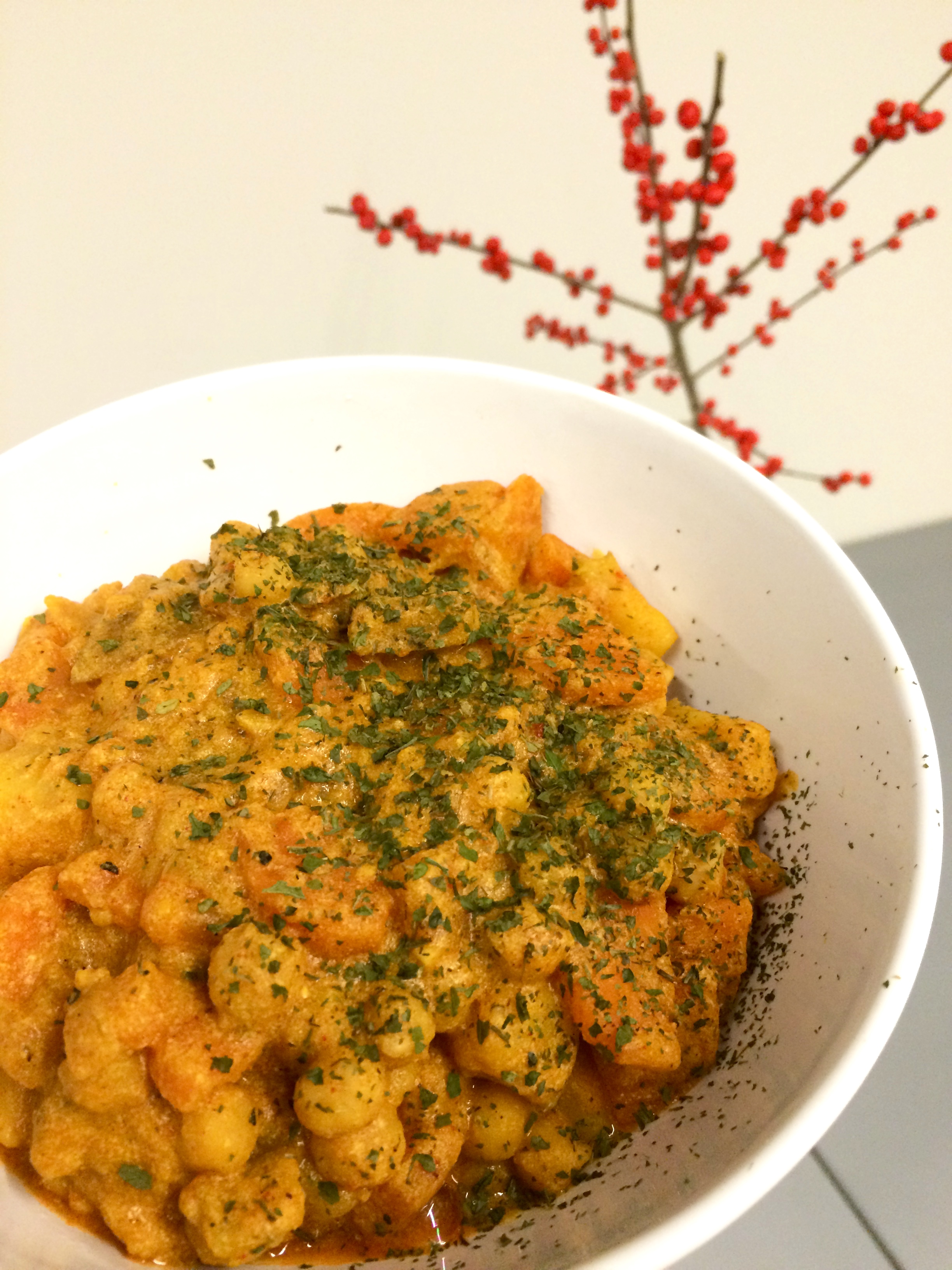 Radau dvi bulves, morką, pusę pakelio avinžirnių ir taip gavosi kàris. Aišku, šitas kàris yra toks iš kirvio išvirtas. Toks 9 su trim minusais, bet vis tiek dar ne 8, kas jau yra gerai.